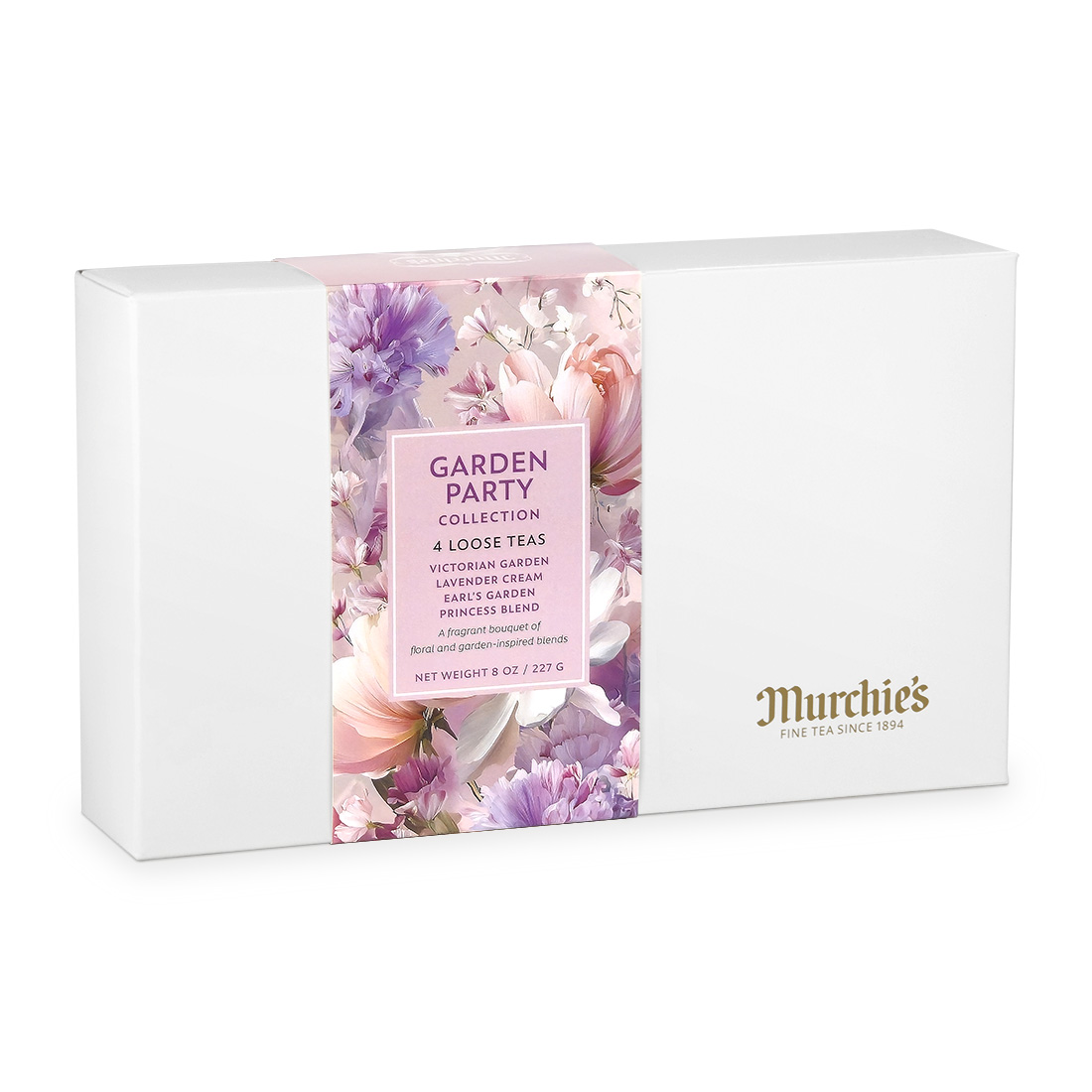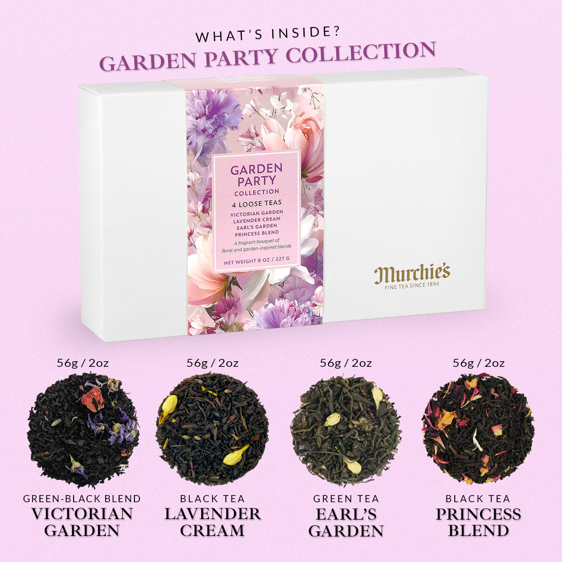 Our Garden Party Collection contains four pouches of loose tea, 2oz/56g each: Victorian Garden, Lavender Cream, Earl's Garden & Princess Blend.