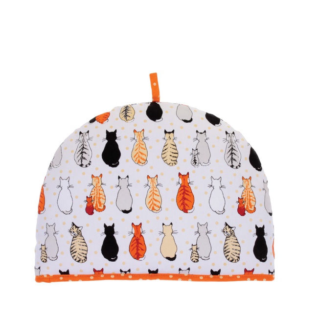 This design illustrates a vast variety of cats waiting with an orange polka dot contrast. Matches perfectly with the Cats In Waiting tea towel and mug. The poly wadding filling keeps your tea warm and a co-ordinated trim and hanging loop add to the design detail.